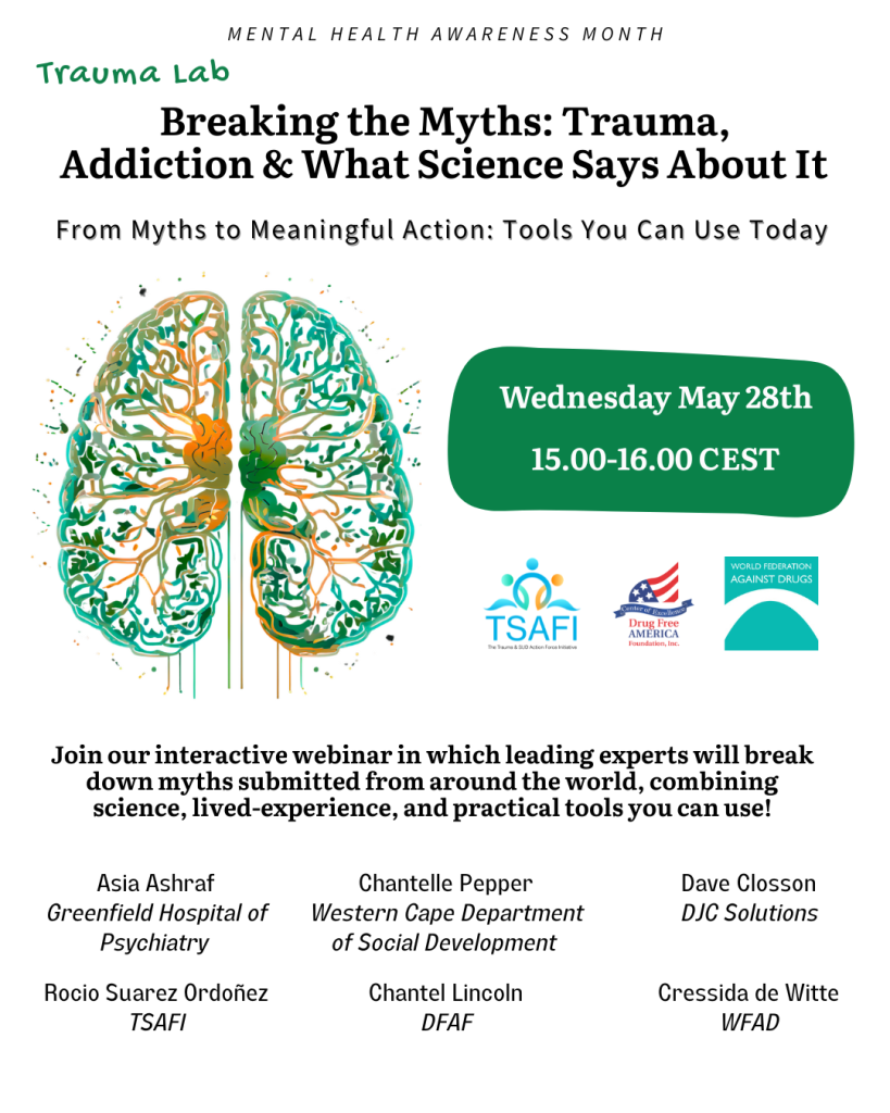 On May 28th at 15.00 CEST, TSAFI, in collaboration with DFAF and WFAD, will be holding a webinar on “Breaking the Myths: Trauma, Addiction & What Science Says About It”. In light of the Mental Health Awareness Month (May), the webinar will debunk myths submitted by members and followers during the global campaign and highlight scientific evidence, lived-experiences, and practical tools.